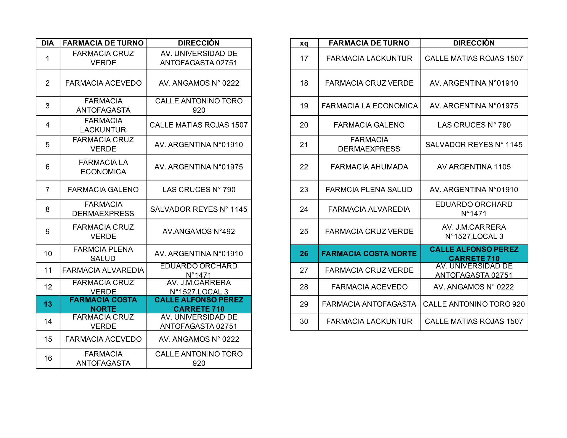 Farmacias de Turno en Antofagasta Sector Sur durante Noviembre de 2025 (09:00 hrs - 21:00 hrs)